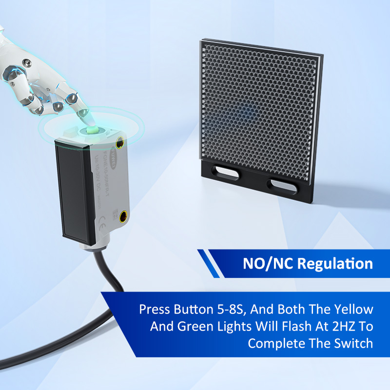 Das Gerät ist mit hoch intelligenten Anpassungsfunktionen ausgestattet. Die Entfernungseinstellungen sind intuitiv und bequem: Überein mit der reflektierenden Platte ausrichten, 2-5 Sekunden lang die Taste drücken, und das gelbgrüne Licht, das bei 4Hz blinkt, zeigt ein erfolgreiches Setup an. Wenn die Doppellichter auf 8Hz asynchrones Blinken umschalten, zeigt sie einen Fehler an und schaltet automatisch auf den maximalen Erkennungsabstand um. Das Schalten zwischen normalerweise geöffneten (NO) und normalerweise geschlossenen (NC) -Modi ist ebenso effizient-drücken Sie die Taste 5-8 Sekunden lang und die Doppellichter blinken synchronisiert bei 2Hz, um zu bestätigen, dass der Modusschalter vollständig ist. Dieser multi-kenario-kompatible linsenreflektierende photoelektrische Schalter macht die Parameteranpassung intuitiver denn je.