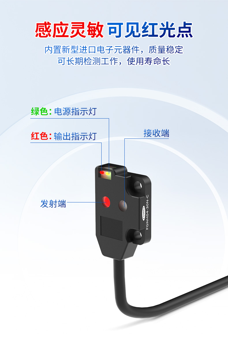 Zweitens enthält der Sensor neue importierte elektronische Komponenten, die einen hochempfindlichen Nachweis mit einem sichtbaren Rotlichtemissionspunkt bieten. Dies verbessert die Sichtbarkeit und Genauigkeit der Erkennung erheblich. Mit stabiler Qualität, Unterstützung des langfristigen kontinuierlichen Betriebs und einer verlängerten Lebensdauer ist es besonders für anspruchsvolle industrielle Umgebungen geeignet. Für Anwendungen, die eine hohe Wiederholbarkeit und Zuverlässigkeit erfordern - wie Sensoren, die Pins für LEDs erkennen -, reduziert dies die falschen Erkennungsraten und die Wartungsfrequenz der Geräte erheblich, wodurch die allgemeine Produktionseffizienz erhöht wird.