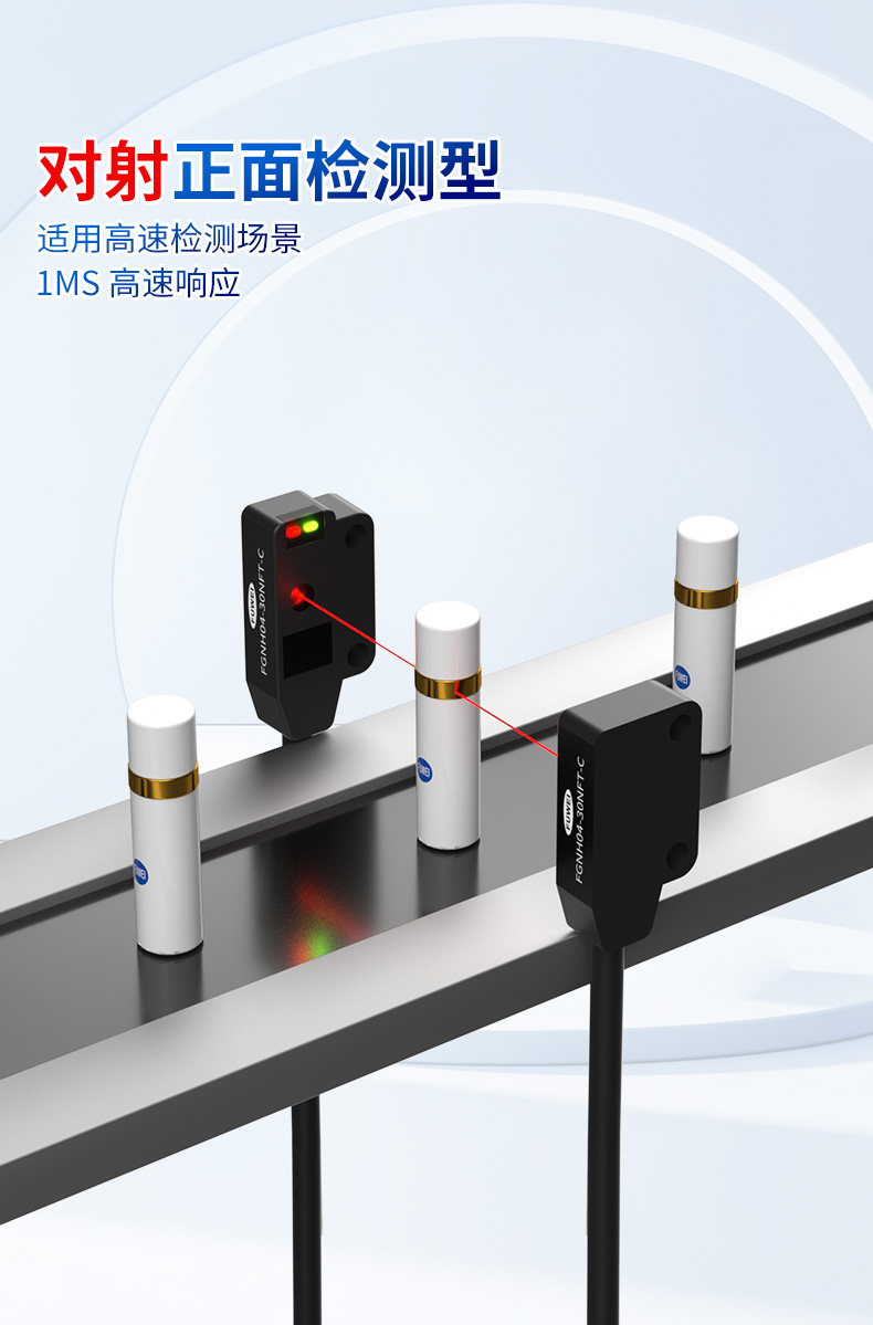 Darüber hinaus bietet die FGNH04-30NFT-Serie mehrere Erkennungsmodi, um Hochgeschwindigkeitsanwendungen umfassend zu unterstützen. Sein Durchschnittseitenerkennung, die durch die Strahlung vordere Fronterkennung und die diffuse Reflexions-Front-Nachweisvarianten liefern alle 1 ms Hochgeschwindigkeitsreaktion, wobei verschiedene Montagepositionen und Erkennungsanforderungen angemessen werden. Insbesondere bei der Inspektion von Pin und Mikrokomponenten ermöglicht der Durchschnittstyp die Obstruktionserkennung durch Kreuzmontage, um die Präsenz des Stifts genau zu bestimmen, während der diffuse Reflexionstyp ohne Empfänger die Nahbereichserkennung erreicht. Mit dieser Multi-Mode-Flexibilität können Benutzer die optimale Konfiguration für ihre spezifischen Anforderungen auswählen, um den stabilen Betrieb von Sensoren zu erfassen, die Pins wie LEDs auf Hochgeschwindigkeitsproduktionslinien erkennen.