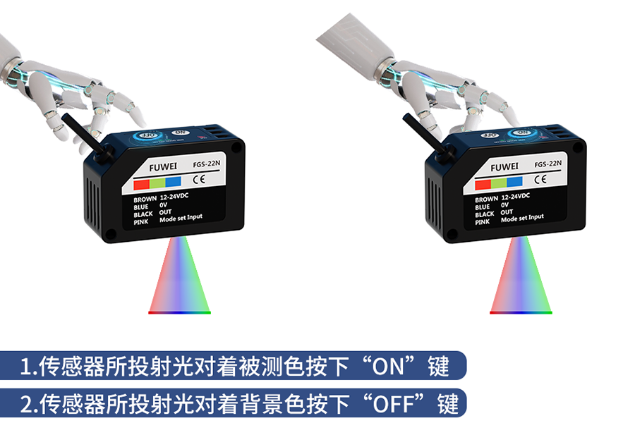 Hochpräziser Farbmodus: Wechseln Sie in diesen Modus, wenn Sie eine extrem feine Differenzierung von Farbunterschieden benötigen. Der FGS-22 beleuchtet gleichzeitig die Primärfarben-LEDs R (Rot), G (Grün) und B (Blau). Es identifiziert Farben durch die Analyse des genauen Verhältnisses der RGB-Farbtöne im reflektierten Licht des Objekts. Diese fortschrittliche Farbsensortechnologie überwindet effektiv Umgebungslichtinterferenzen und Oberflächenstrukturschwankungen und ermöglicht so eine äußerst zuverlässige Identifizierung komplexer Farben. Es ist ideal für hochpräzise Anwendungen wie die Bewertung der Produktqualität und die Prüfung von Lackfarbunterschieden.