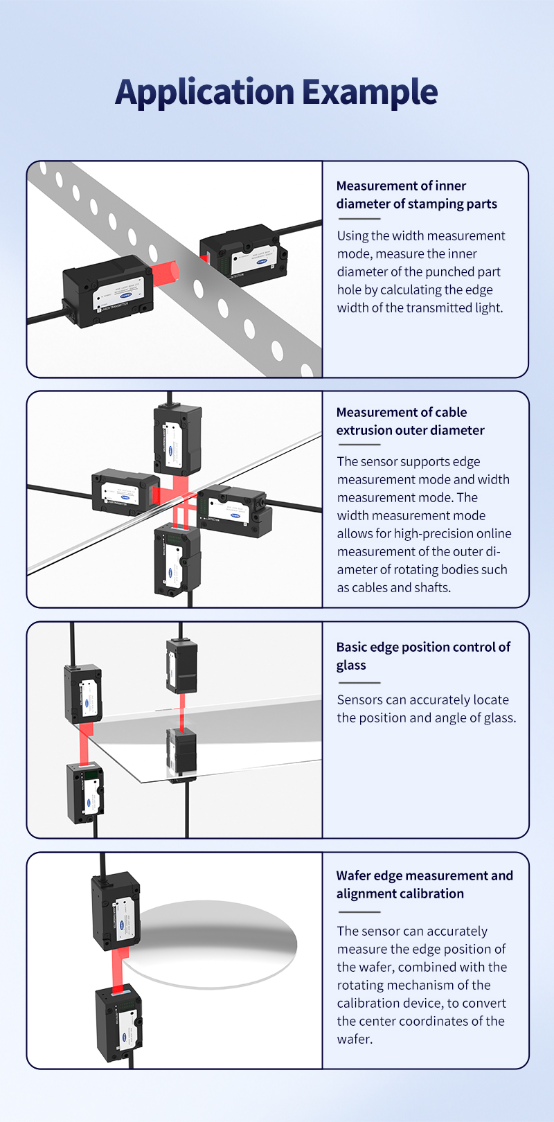 Waferkantenpositionierung und Wicklung Deskew: Für die Halbleiterherstellung kann das miniaturisierte Design des Sensors in schmale Räume eingebettet werden, und der 14*12 -mm -Fleck identifiziert die Waferkontur genau.