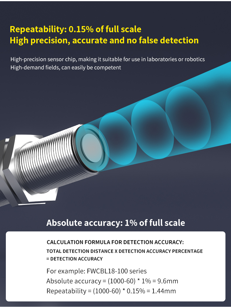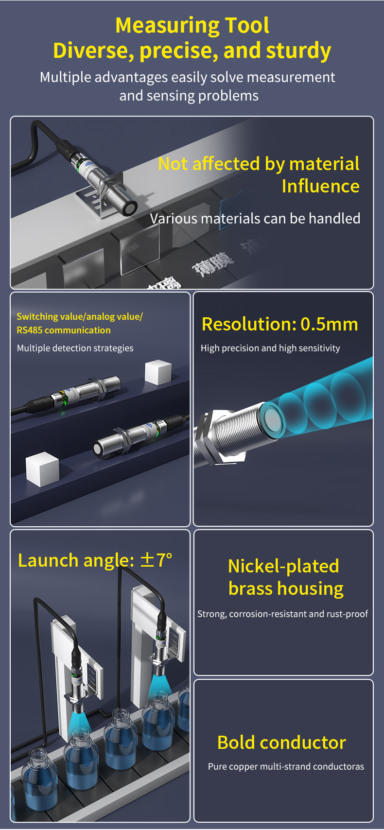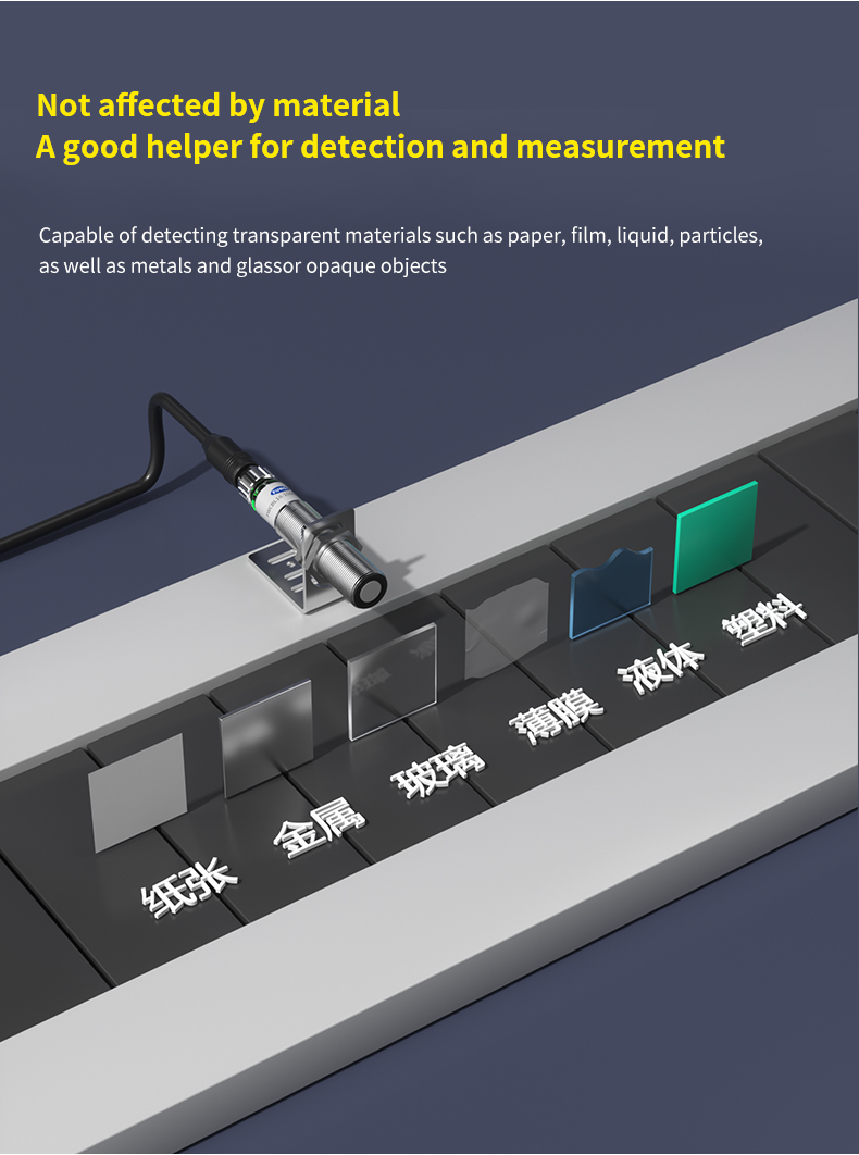 Mit einer hohen Präzision von 0,5 mm Auflösung und einem schmalen Emissionswinkel von ±7° gewährleistet es extreme Messgenauigkeit und hervorragende Störfestigkeit. Unabhängig von der Zieloberfläche – lichtabsorbierend, reflektierend oder transparent – liefert es eine stabile Leistung, völlig unabhängig vom Material oder der Farbe des erkannten Objekts.