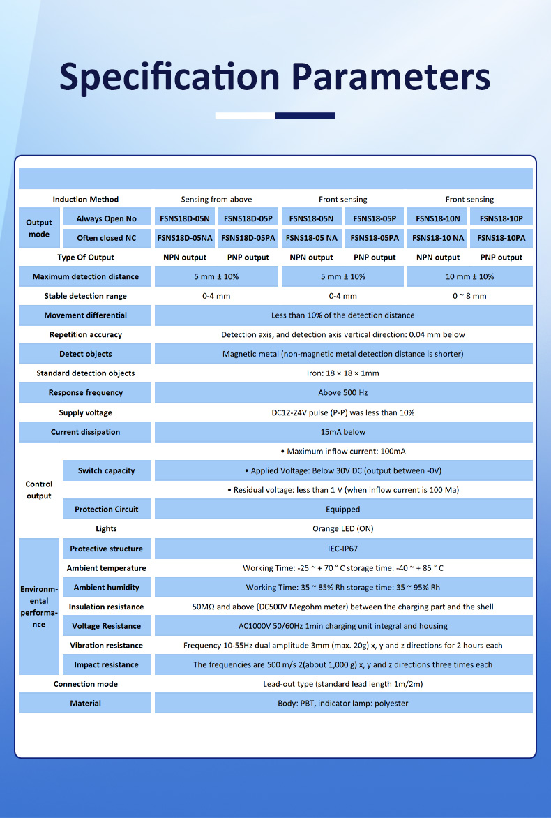 Der FSNS18D-05 ist auf Vielseitigkeit ausgelegt. Hier sind die wichtigsten Anwendungsszenarien: Werkzeugmaschinenausrüstung und Drehmaschinen: Ideal für die Werkzeugpositionierung, Revolverausrichtung und Endlagenerkennung. Seine Zuverlässigkeit gewährleistet Bearbeitungsgenauigkeit und schützt teure Geräte. Textilindustrie: Wird zur Erkennung von Garnbrüchen, zur Überwachung der Position des Webstuhls und zum Zählen von Stoffrollen verwendet. Beständig gegen Flusen und Vibrationen.Autoreparatur und Automobilmontage: Perfekt für die Positionierung von Roboterschweißpistolen, die Überprüfung der Anwesenheit von Teilen auf Vorrichtungen und die Erkennung von Klammern und Vorrichtungen.Logistik und Montagelinien: Hervorragend geeignet für die Palettenerkennung, das Vorhandensein von Objekten in Sortiersystemen und das Zählen von Kisten auf Förderbändern.Chemische Industrie: Das robuste Gehäuse hält der Belastung durch viele Chemikalien stand und eignet sich daher für die Rückmeldung der Ventilposition und die Füllstanderkennung in nicht aggressiven Umgebungen.